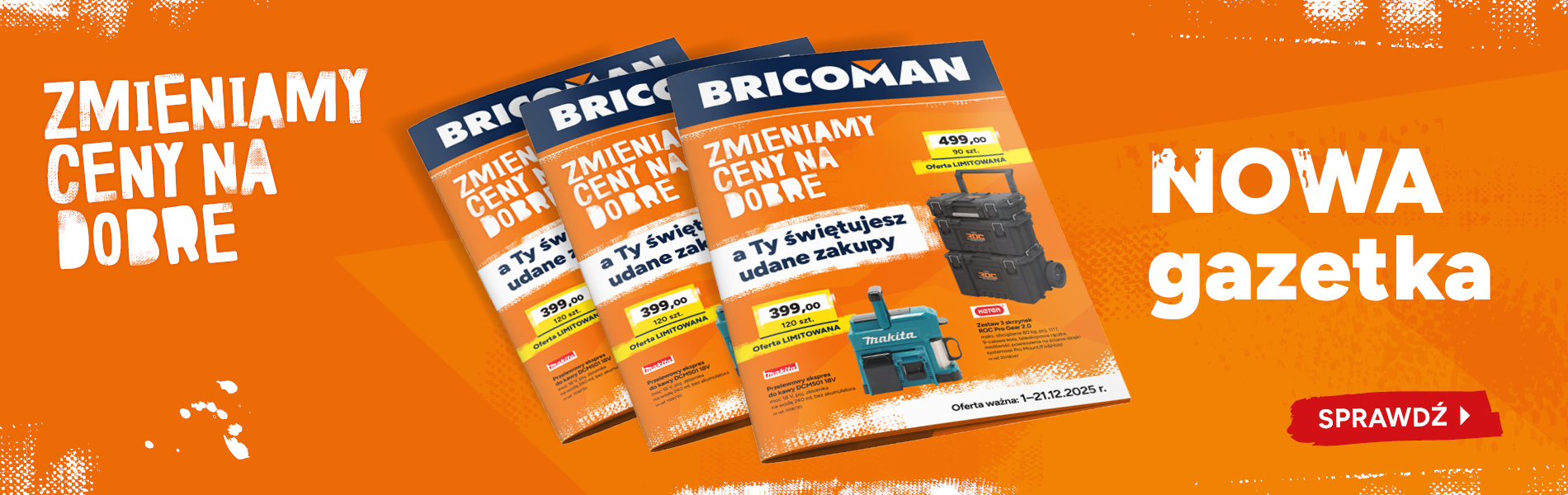 Bricoman to nowoczesny sklep budowlany, w którym znajdziesz szeroką gamę asortymentu niezbędnego do wybudowania i urządzenia domu. Rosnące zaufanie naszych klientów oraz renoma budowana przez wiele lat stały się motorem napędowym dynamicznego rozwoju i rozbudowy sklepu budowlanego. W ofercie znajdziesz niezbędne materiały budowlane, jak np. pokrycia dachowe, płytki ceramiczne, a także narzędzia dla majsterkowiczów i profesjonalistów.