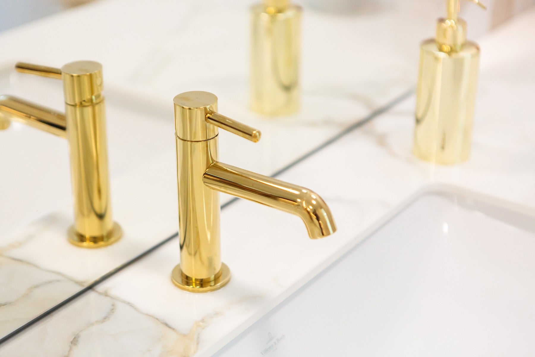 Złote baterie łazienkowe zyskują bardzo dobre opinie dekoratorów – są eleganckie, ocieplają wnętrze i pasują do wielu stylów.